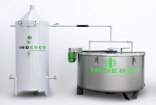 Con respecto a la Caldera, ésta se encuentra fabricada en chapa de acero de calidad 1010. Respecto a su alimentación, las dos opciones disponibles son: a) Gas natural de red; y b) Gas envasado, por medio de 3 (tres) garrafas de 10 kg. cada una. La Caldera cuenta con 50 (cincuenta) tubos internos para transmisión y distribución del calor. Además, está equipada con válvula de seguridad, presostato de corte, manómetro y visor del nivel del agua. La Caldera cuenta, además, con canillas para purga y llenado de agua, y salida de vapor en su parte superior. Por otra parte, posee mechero con comando eléctrico, con corte y arranque automáticos. Trabaja con una presión de 2 kg/cm2, y su capacidad es de 260 litros de agua, que le permite suministrar un flujo de vapor de 50 kg/hora, mientras que su consumo estimado es de 1 kg. de vapor por ciclo de lavado. El equipo se comercializa acompañado de 2 (dos) recipientes de acero inoxidable para recolección de cera fundida.